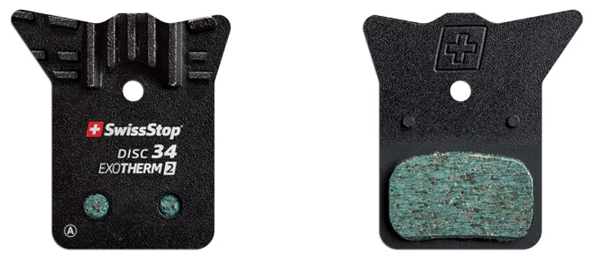Le SwissStop 34 EXOTherm2 combine un mélange de gomme extrêmement durable et modulable de manière homogène avec une plaque arrière dotée d’ailettes de refroidissement qui permet un freinage stable et puissant dans toutes les conditions.