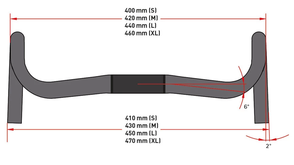 - Compact Drop and Reach : la courbure réduite du guidon permet une position assise plus compacte et facilite la préhension des leviers de vitesses et de freins ; le drop plus faible permet d’atteindre plus facilement le guidon inférieur
